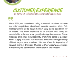 The route of fresh produce from harvest to sale is often unknown to consumers. The ability to maintain freshness during this phase is nonetheless crucial for growers: it has a major impact on product quality, quantities sold, and possible outlets. In a word: on the proper valorization of the production. The Janny MT modular solution responds naturally and sustainably to these post-harvest challenges, adapting to the size of each farm.