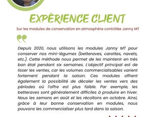 Le parcours des produits frais de la récolte à la vente est le plus souvent inconnu des consommateurs. La capacité à maintenir la fraîcheur durant cette phase n'en est pas moins cruciale pour les producteurs : elle a des impacts majeurs sur la qualité des produits, sur les quantités vendues, et sur les débouchés possibles. En un mot: sur la bonne valorisation de la production. La solution modulaire Janny MT répond de manière naturelle et durable à ces enjeux du post-récolte, en s'adaptant à la taille de chaque exploitation.