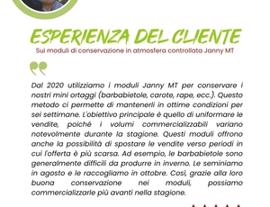 Il percorso dei prodotti freschi dal raccolto alla vendita è per lo più sconosciuto ai consumatori. La capacità di mantenere la freschezza durante questa fase non è altrettanto cruciale per i produttori: ha un impatto importante sulla qualità dei prodotti, sulle quantità vendute e sui possibili sbocchi. In poche parole: sulla giusta valutazione della produzione. La soluzione modulare Janny MT fornisce una risposta naturale e sostenibile a queste sfide post-raccolta, adattandosi alle dimensioni di ogni azienda.